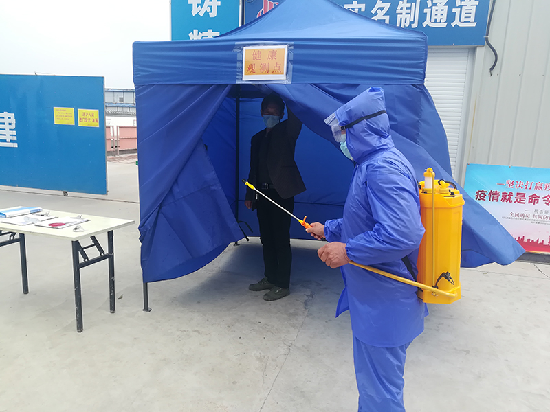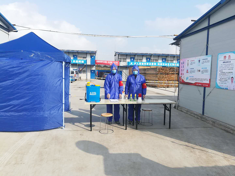 防疫消毒棚。現(xiàn)場防疫第一道屏障,所有復工人員及外訪人員都需要在此處接受體溫檢測及消毒,合格后方能登記入場。