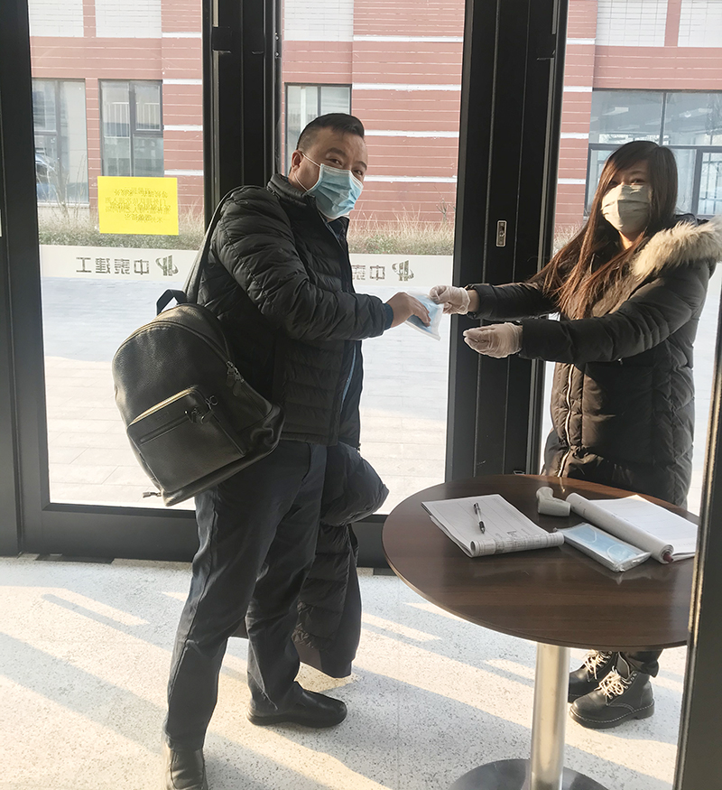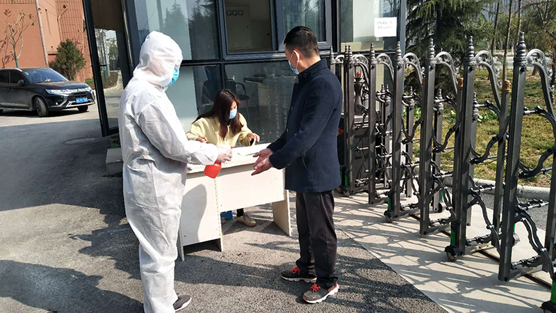 嚴控出入,守好第一關。每一個出入公司的人員,都要做好個人信息登記、全身消毒、體溫測量、佩戴口罩等日常防疫工作。