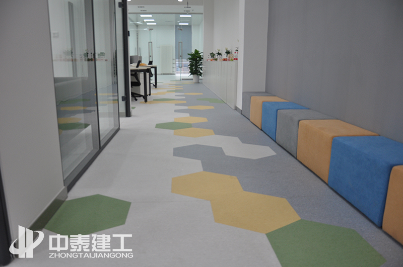 地板采用進(jìn)口PVC,多色拼花,以多元配色手法帶來充滿變化的豐盈視覺,并在變化中力求每個個體各自的呼應(yīng),呈現(xiàn)出高級的平衡感。整個空間簡約時尚、煥發(fā)生機。