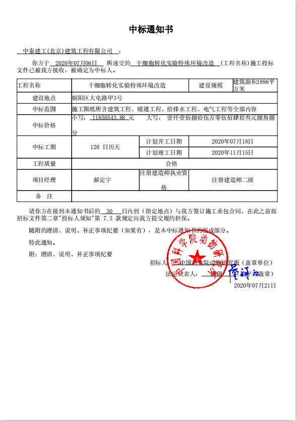 10 2020-08-07 中泰建工中標凈化工程項目 風雨兼程創佳績,凝心聚力開新篇! 中泰建工喜訊不斷,捷報連連,成功中標「中國科學院動物研究所干細胞實驗室凈化工程項目」。