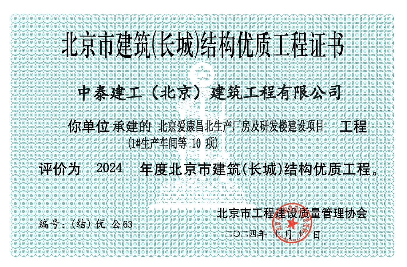 中泰建工 | 榮獲“北京市建筑(長城)結構優質工程”