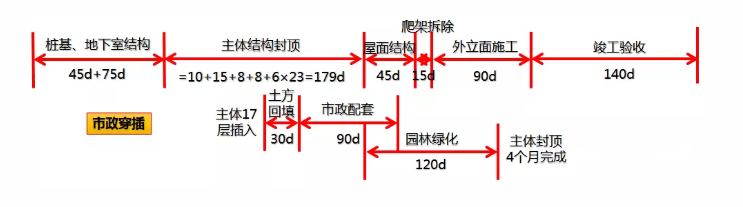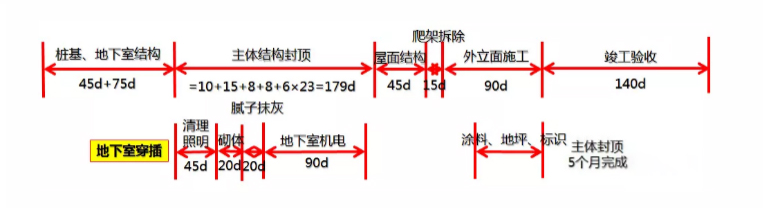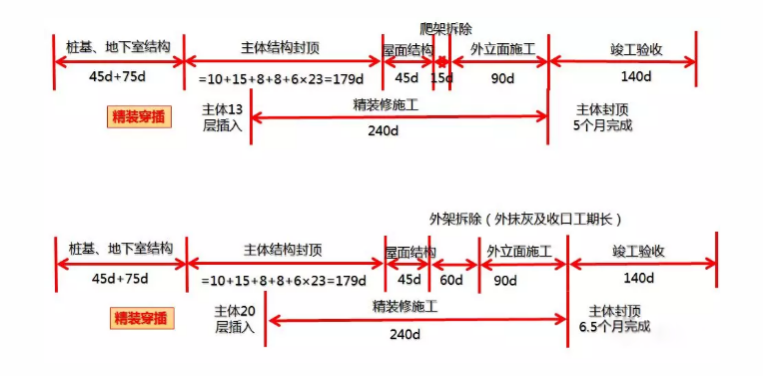 精裝進(jìn)場時(shí)間:=N/n+28/6+1=11層精裝完成時(shí)間:=19*6+(M-1) *6 =150天(相對(duì)主體結(jié)構(gòu)封頂)