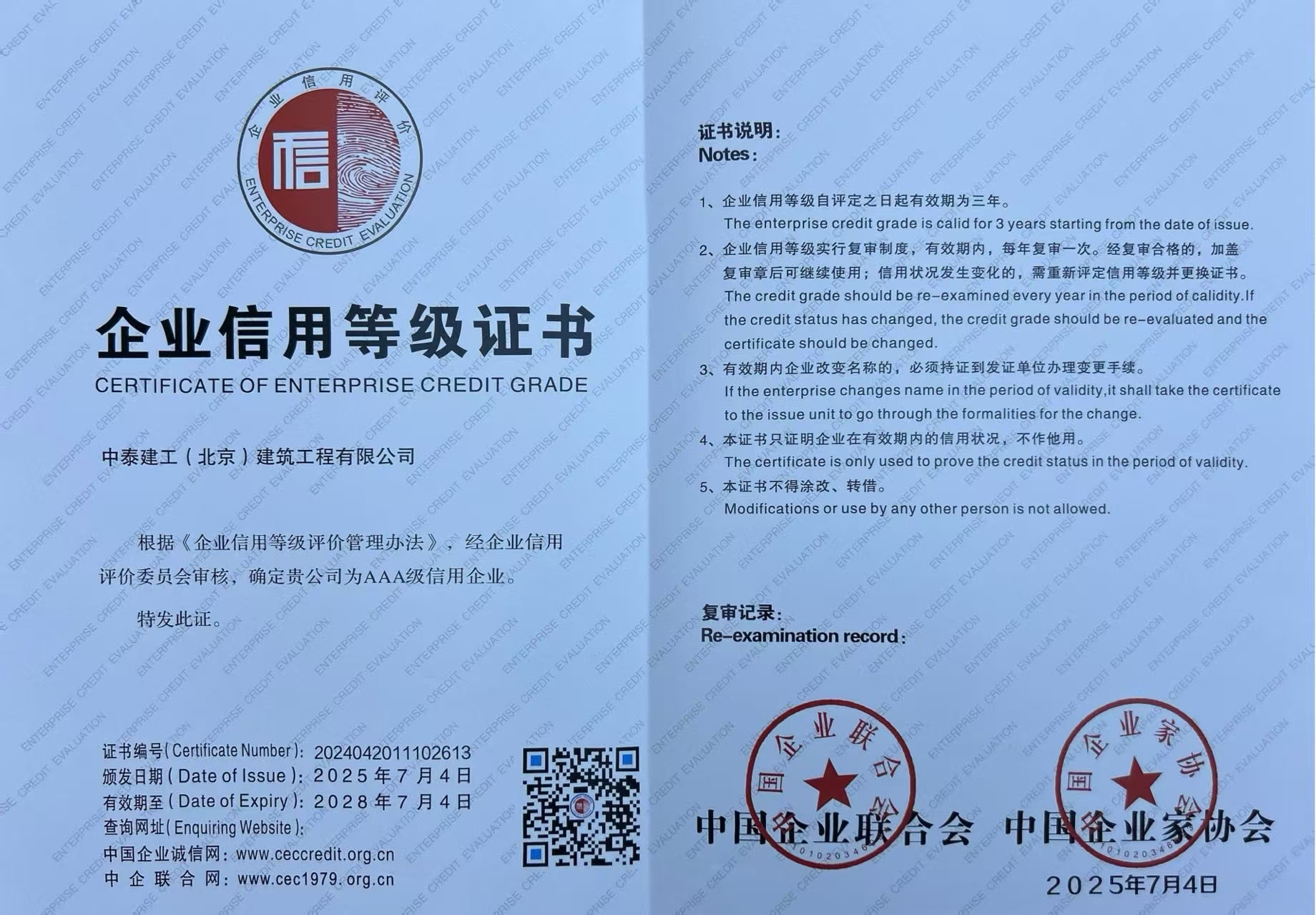 中國企業聯合會、中國企業家協會企業信用評價由基礎信用能力、經營與競爭等5個一級指標及若干二、三級指標組成,全面綜合考核企業誠信建設與信用管理能力和水平,旨在提高企業誠信建設水平,推動企業誠信自律,提升企業管理水平。評價體系信用等級分為三等五級,其中AAA級為最高等級,代表著企業在信用建設方面的卓越表現,信用評價等級結果已成為企業經營發展和獲得市場認可的誠信標志。 信用是企業發展的基石,也是市場合作的紐帶。公司自成立以來,始終以“信守承諾、勇于擔當”為準則,嚴格履行合同約定,保證工程質量、安全生產。憑借高效的項目管理和“一次合作,終生服務”的理念,贏得了客戶的信賴與贊譽。