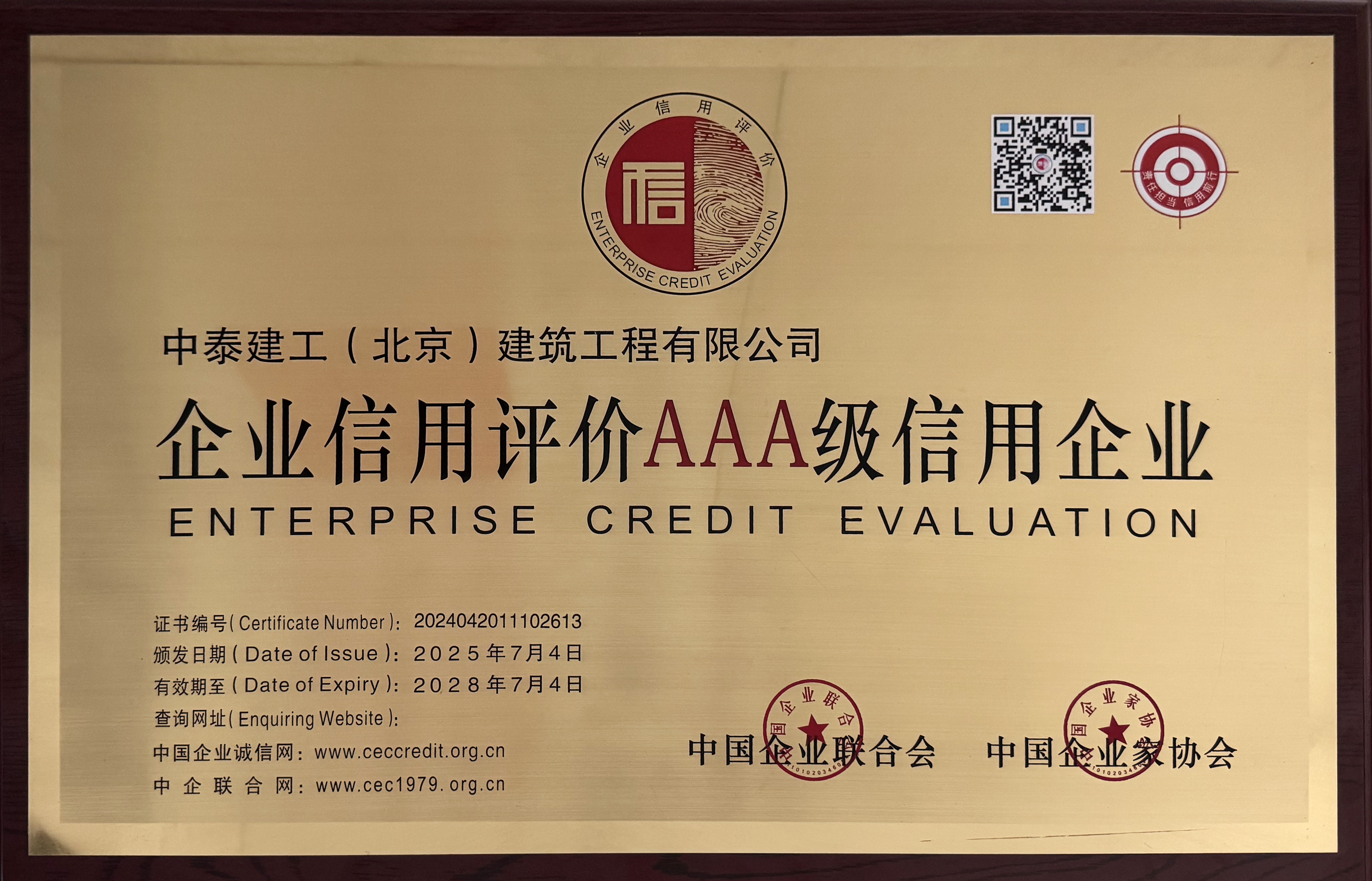 一次合作 終生服務 近日,中國企業聯合會、中國企業家協會正式公布AAA級信用企業名單”,中泰建工(北京)建筑工程有限公司憑借穩健的經營實力、良好的履約記錄與卓越的信用管理水平,成功榮獲“AAA級信用企業”認證!這一榮譽不僅是對企業綜合實力的高度認可,更是對我們多年來堅守“誠信經營”的最佳見證。 中國企聯黨委委員、駐會副會長梁彥為中泰建工頒發榮譽資質,中泰建工黨支部書記趙立國代表公司領取牌匾及榮譽證書。中國企聯雇主工作部主任張文濤、中國企聯雇主工作部副主任馬超、北京企業聯合會副會長王翠霞出席授牌儀式。